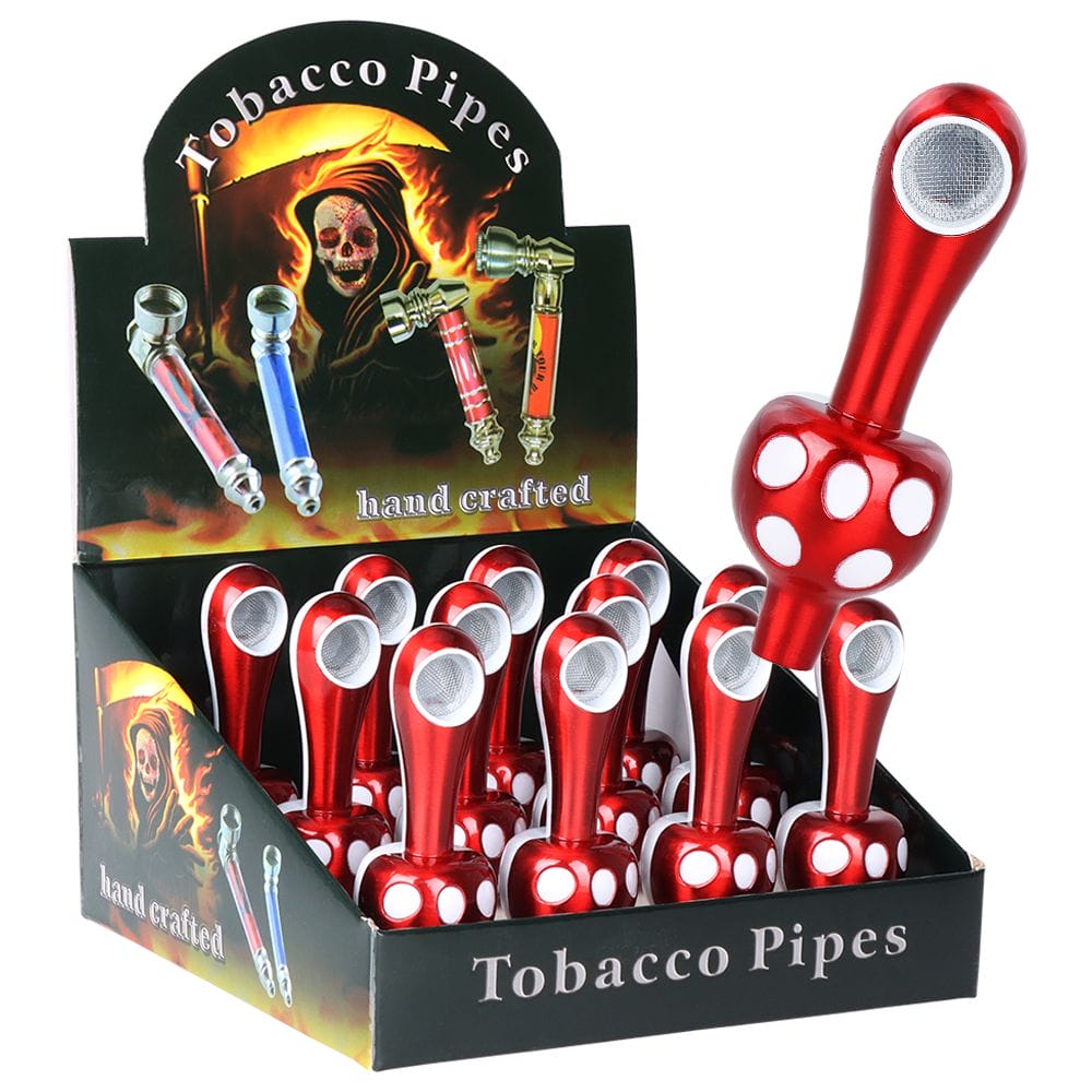 12-count display 3.75 inches long Metal hand pipe Spotted mushroom design Half red-half white Lightweight aluminum material Built-in metal screen