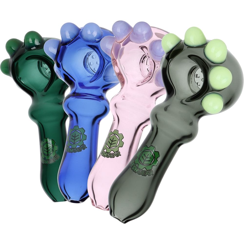 4-count bundle 4 inches long Spoon style hand pipe Built-in bowl screen Large marble decorations on bowl head Borosilicate glass SeshGear logo Assorted colors