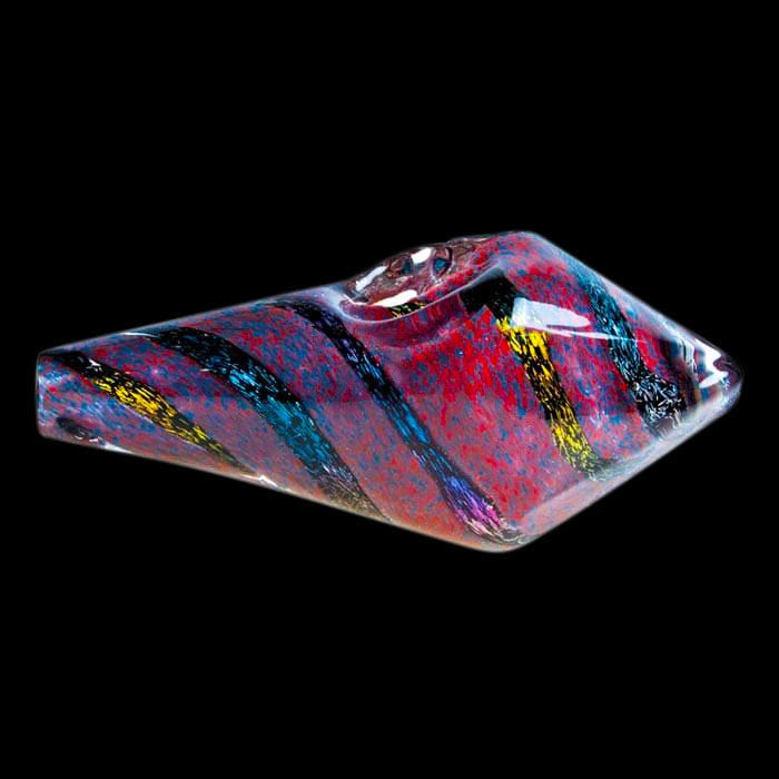 The LA Pipes “Gemstone” with dichroic glass is a truly unique glass pipe. Colored with frit glass and a spiraling dichroic glass strip, this pipe is shaped from the outside to resemble the shape of a crystal or cut gem stone. This is one of our most unique pipes. This glass work of art will certainly standout in our pipe collection. It has good pocket size and a thick sturdy hand feel.