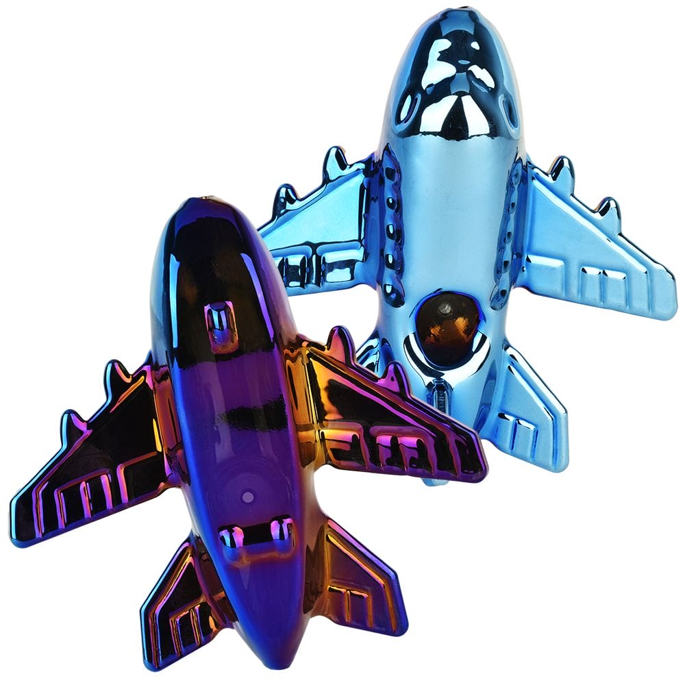 5.5 inches long Novelty hand pipes Jet airliner shape Electroplated finish Borosilicate glass Colors vary