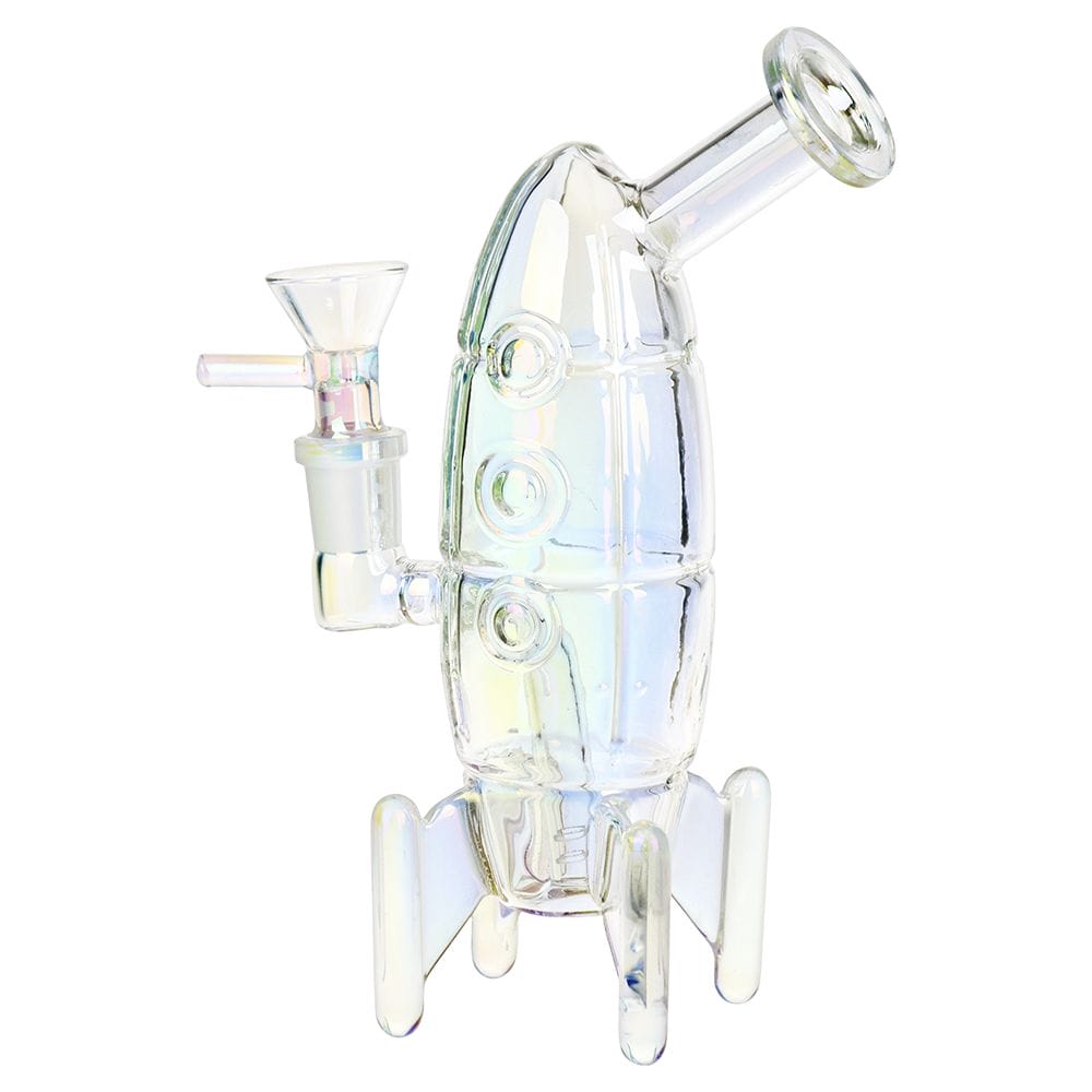 7 inches tall Novelty water pipe Rocketship shape Electroplated finish Fixed downstem Angled mouthpiece Borosilicate glass Includes 14mm male herb slide w/ handle