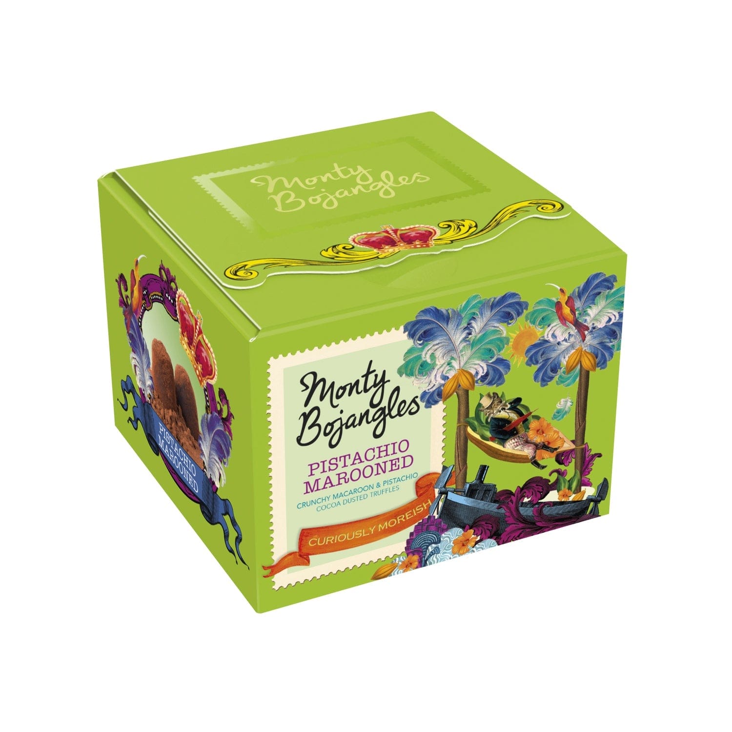 Pistachio Marooned gift box of pistachio flavoured cocoa dusted truffles with macaron drops – Outer: 8