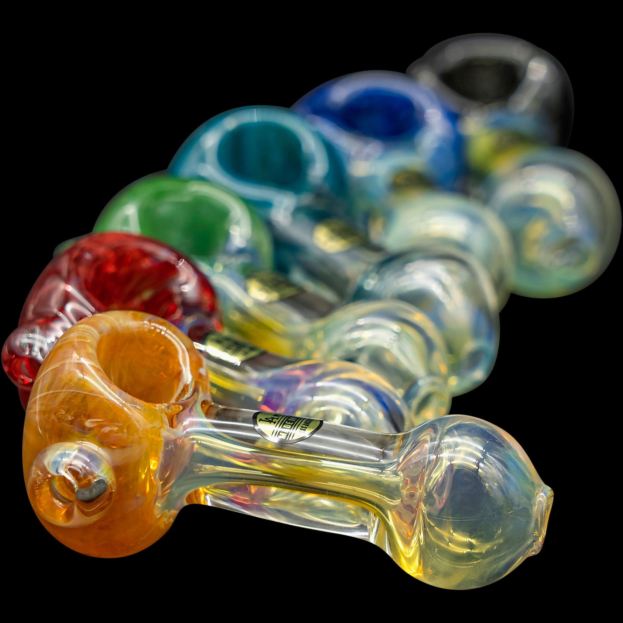 The “Thick Neck” is just what it sounds like. Thick ass neck, silver fumed (color changing), wrap-n-rake color head, fat bowl, perfect carb, flared mouthpiece, and just all around the perfect utility glass hand-pipe. This class design spoon pipe has been a staple in the line for over a decade. If you a need functional glass pipe, that’s durable yet stylish, the “Thick Neck” spoon glass pipe is the choice for you.