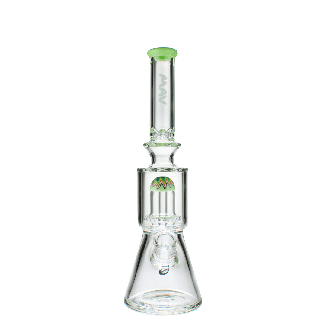 Our UFO beaker will elevate your sesh and take you to space with every hit! This 13″ beaker features a second smoke chamber with a worked UFO Reversal perc adding extra diffusion and coolness. With an added ice pinch and splash guard at the top, this piece can provide a smooth hit every sesh.